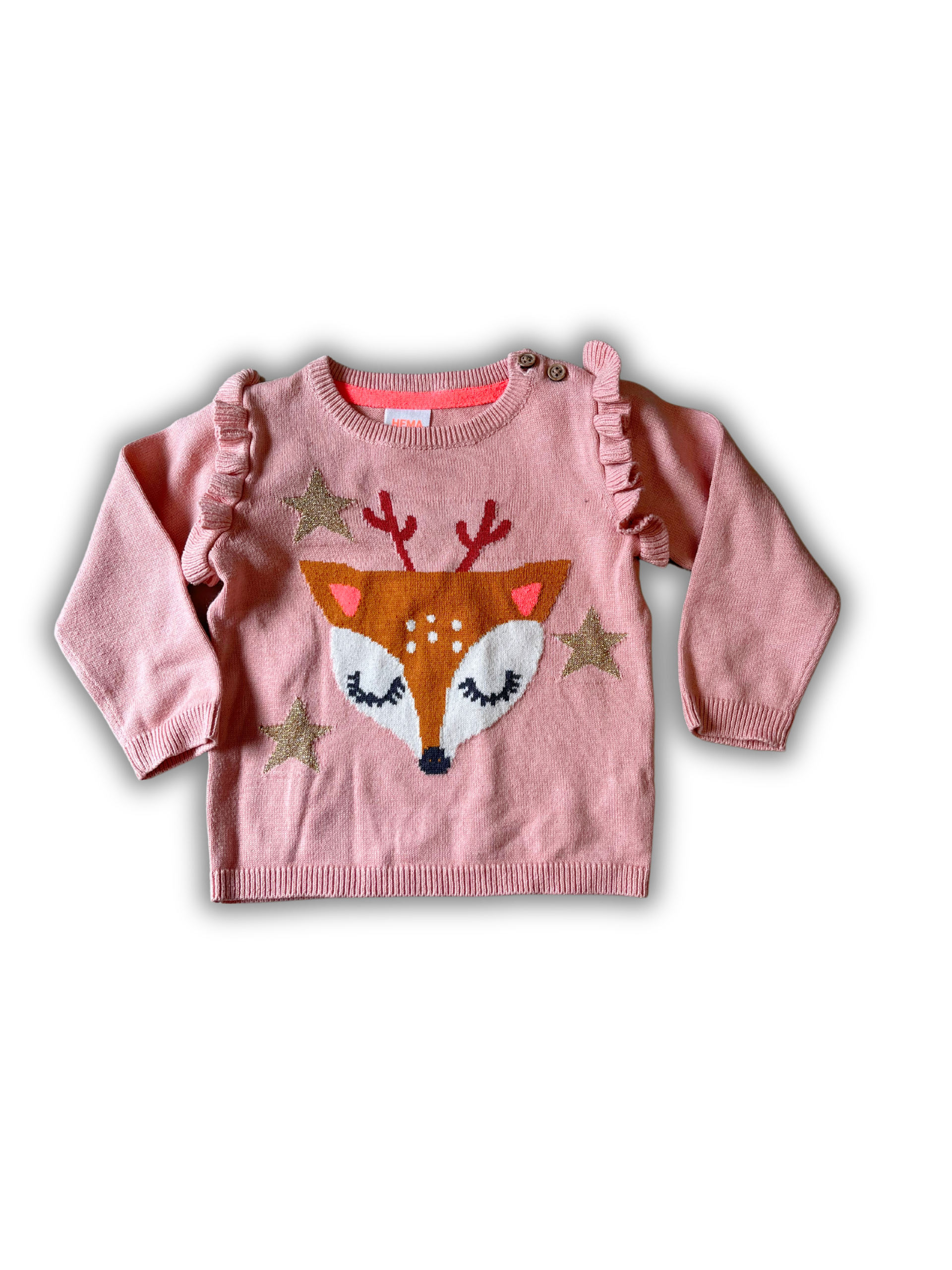Lichtroze gebreide trui van Hema met schattig hertje, goude sterren en ruffles op de schouders.