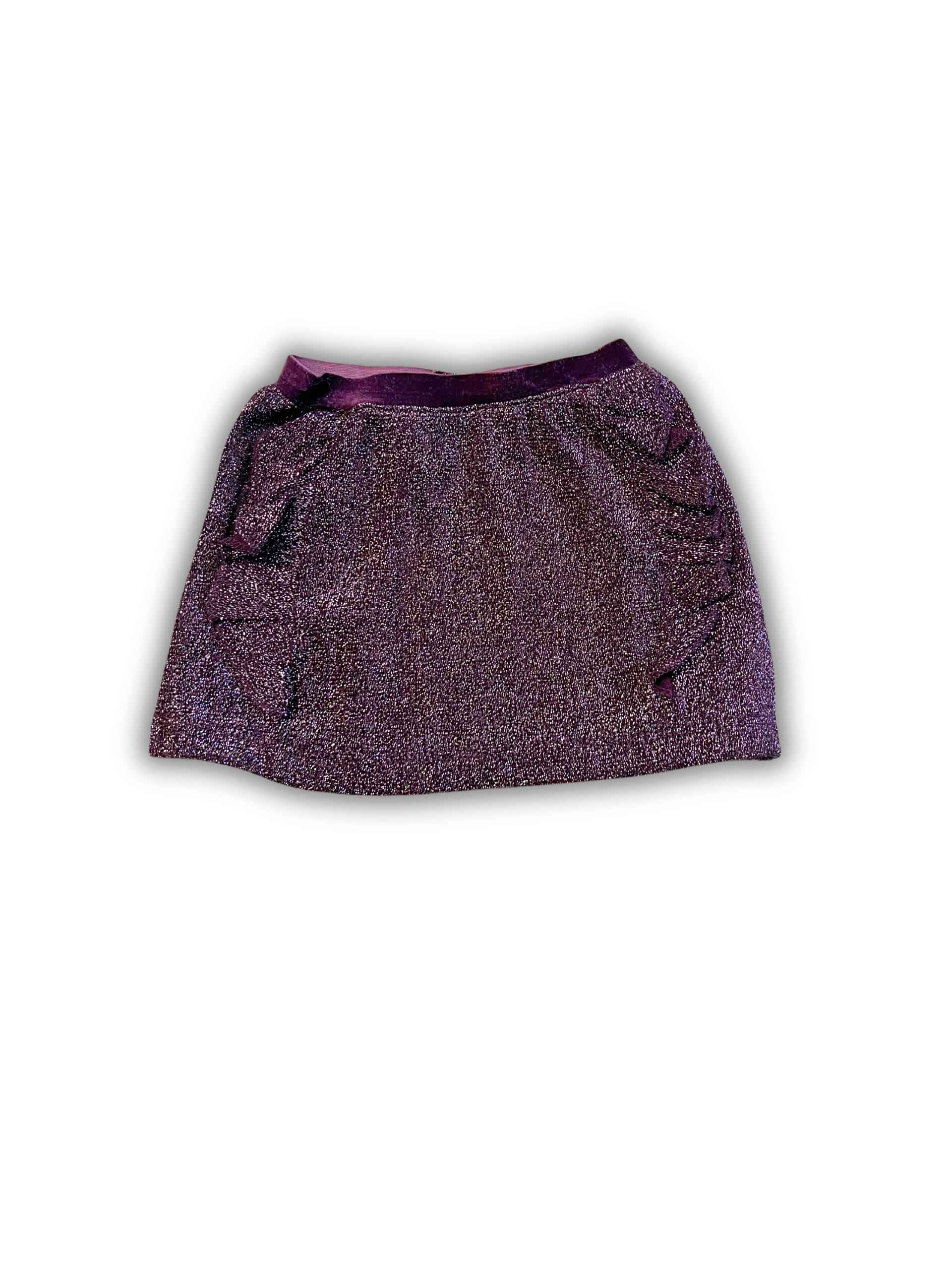 Aubergine paarse set van Prenatal met glitters. Bestaande uit een glittertop met ruffles op de schouders. Glitter rokje met fluwele tailleband en bijpassende legging.