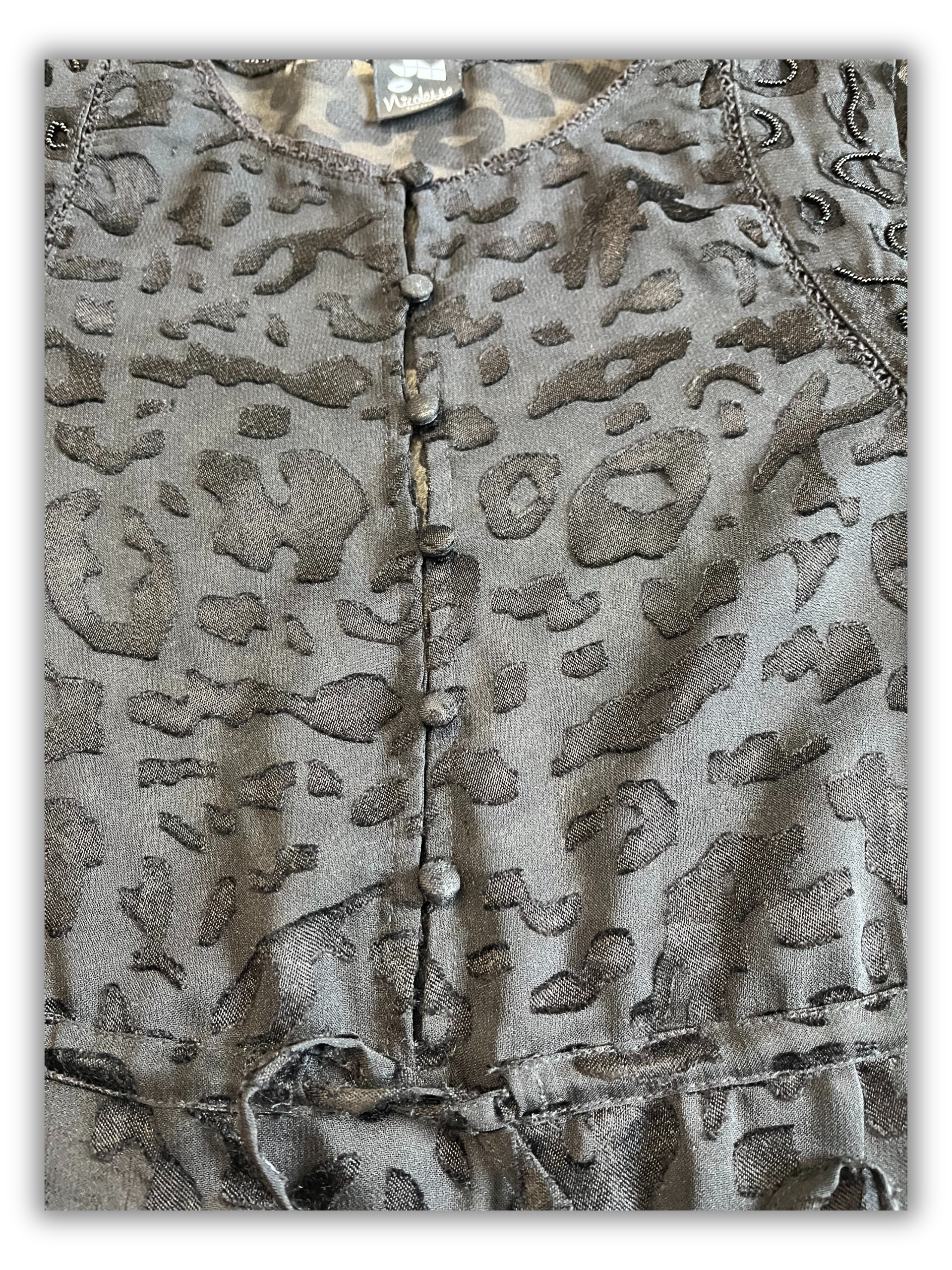 Zwarte jurk van JM(Shoeby) x Nicolette van Dam. Het jurkje heeft een soort kant in panterprint motief. Er zit een los zwart onderjurkje met spagetti bandjes bij. Het jurkje is heel mooi afgewerkt met kraaltjes op de kapmouwtjes en heeft een koord in de taille om het jurkje mooi te kunnen tailleren. Aan de voorkant tot aan de tailleband zit een mooie knoopsluiting.