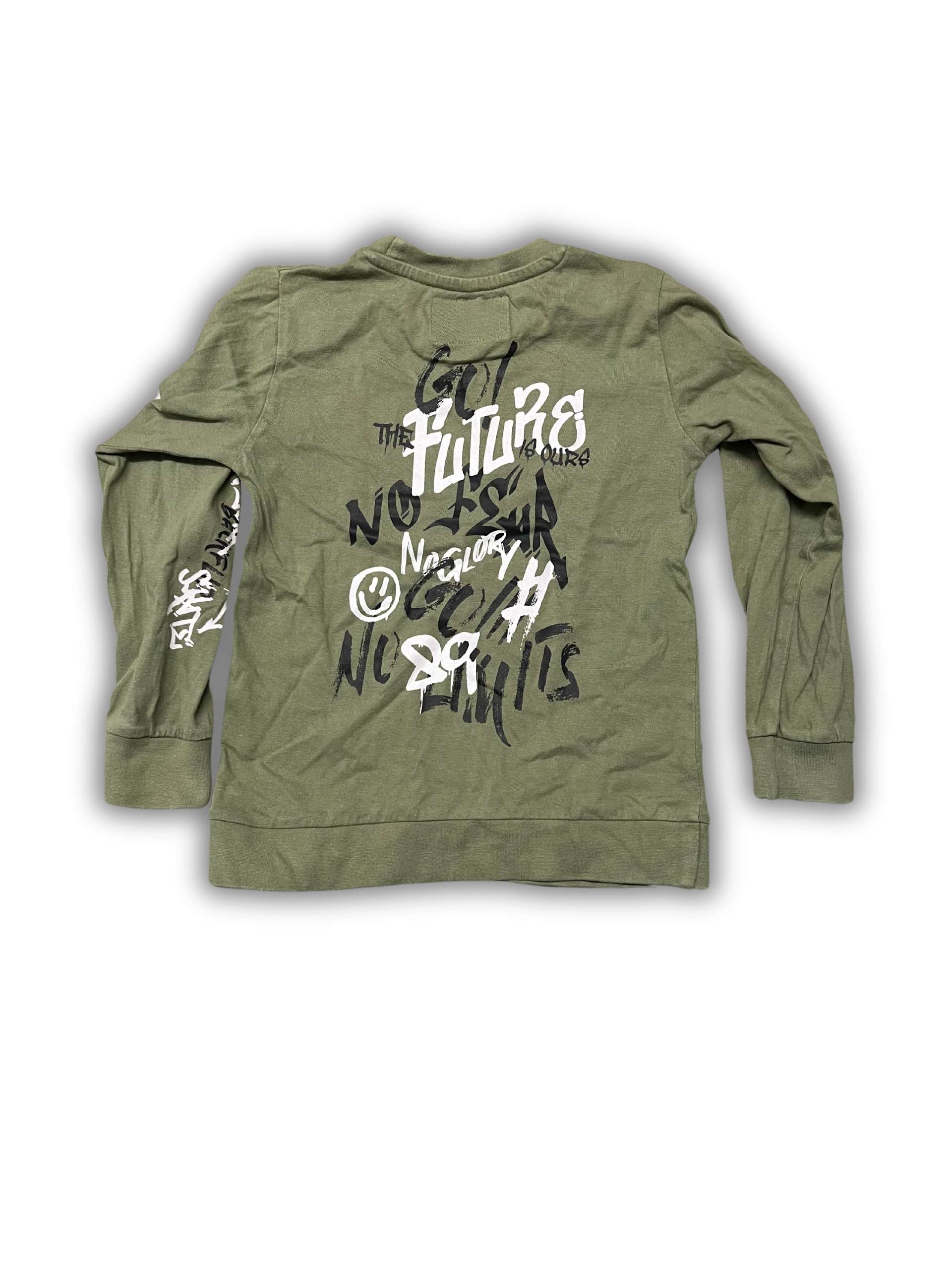 Legergroene longsleeve van Ravagio met stoere tekst op de rug en mouw