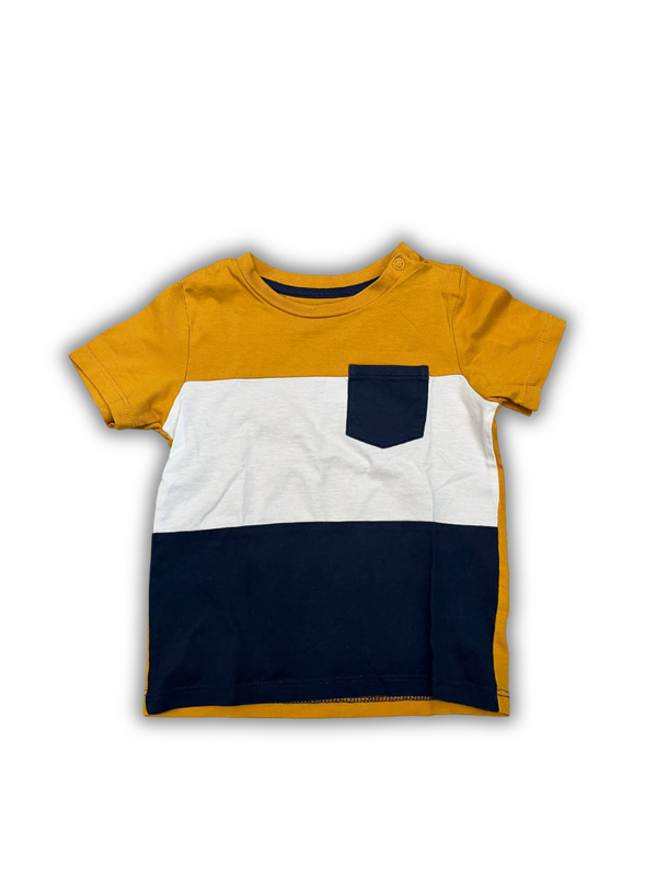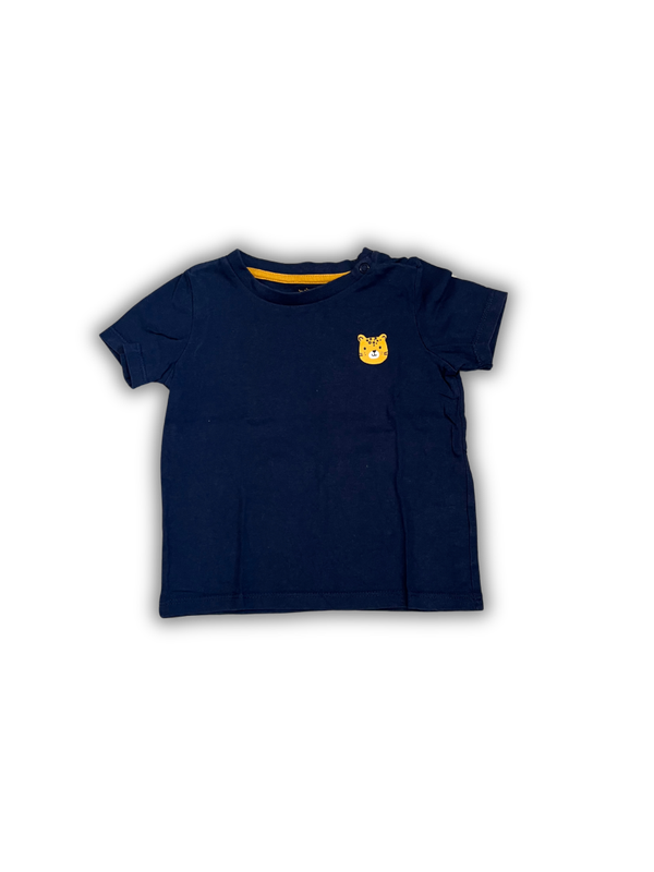 Set van 2 t-shirts van C&A. Eén t-shirt is donkerblauw met een geel tijgerhoofdje erop. Het andere t-shirt heeft gele, witte en donkerblauwe vlakken met een borstzakje.