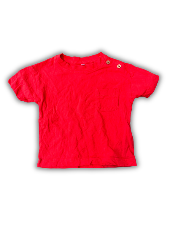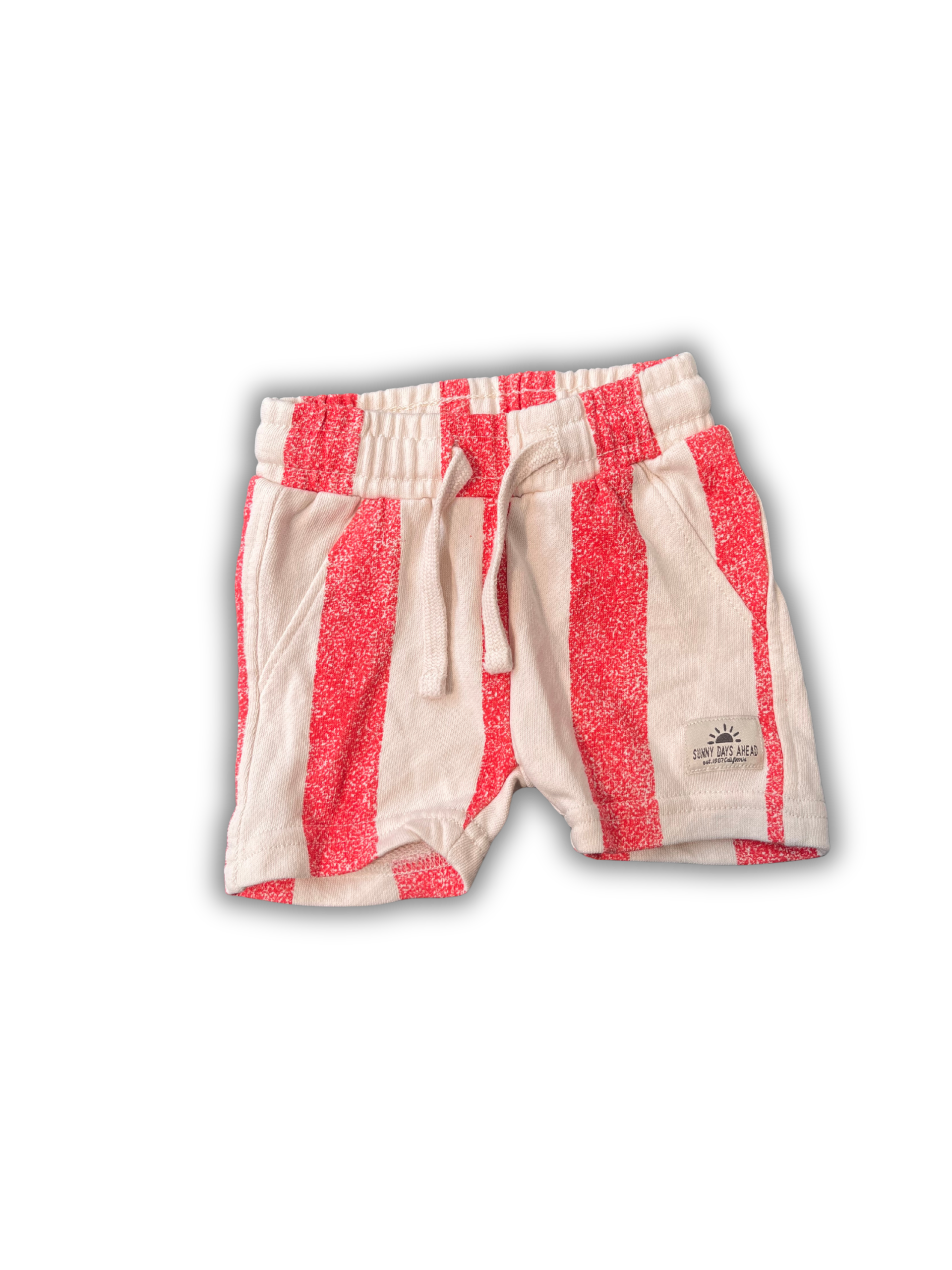 Zomerset van Zeeman bestaande uit een rood basic t-shirt met houten knoopjes en een borstzakje en een comfortabel jogging shortje in rood en witte strepen. Het broekje heeft een strikkoord in de elastieke tailleband voor een goed pasvorm.