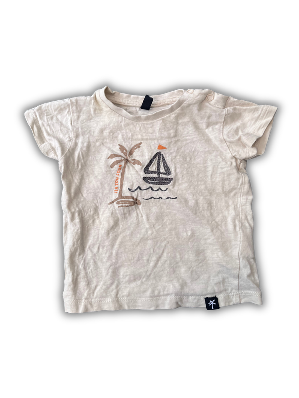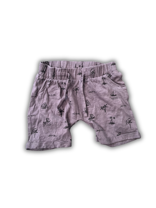 Zomersetje van Wibra bestaande uit een t-shirt en korte broek. Het t-shirtje is beige met een print op de borst. Het bijpassende comfortabele shortje is antraciet grijs met all over print. De korte broek heeft een koordje in de elastieke tailleband voor een goede pasvorm.