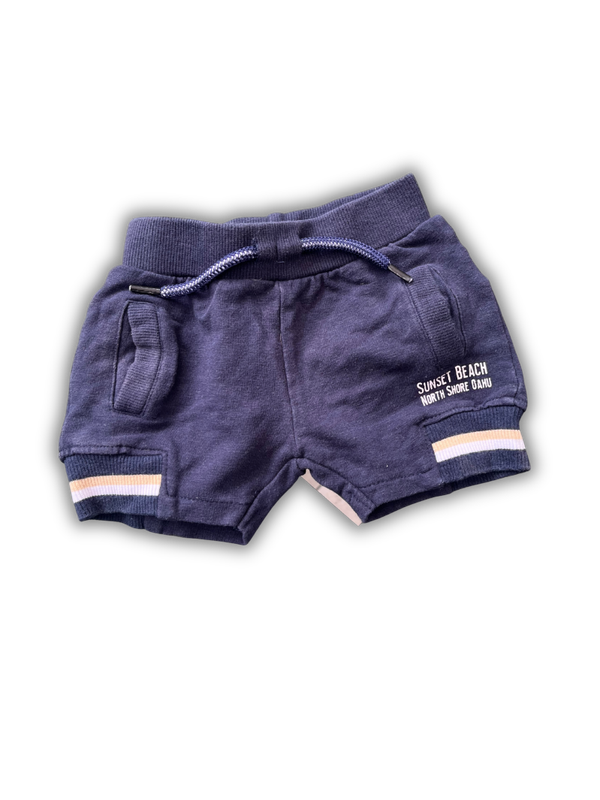 Zomerset van Dirkje bestaande uit een t-shirt en short. Het t-shirt is lichtbruin met letters in diverse kleuren op de voorkant. Het korte broekje is van een comfortabele joggingstof in donkerblauw.