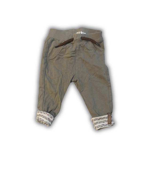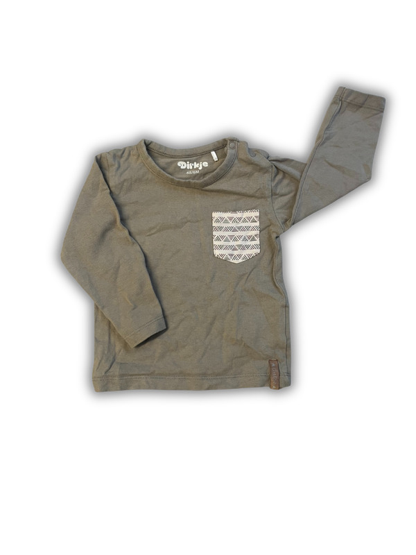 Zandkleurige set van Dirkje. De set bestaat uit een longsleeve en broekje. De longsleeve heeft een borstzakje met leuk motiefje, dit motiefje komt terug in de omslag aan de onderkant van de broekspijpen. Het broekje heeft een bruin strikkoordje voor een goede pasvorm