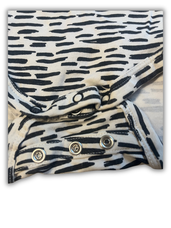 Bamboe meegroei romper van Hema. De romper heeft een leuk streepjes print in wit en zwart. De romper heeft lange mouwen en is een overslag model met drukknoopjes voor makkelijk aan en uit kleden. De romper heeft in het kruis een dubbele rij knoopjes waardoor deze romper met je kindje mee groeit. Hierdoor heb je nog langer plezier van de romper. De romper is gemaakt van bamboe wat betekent dat de stof lekker rekbaar en ademend is.