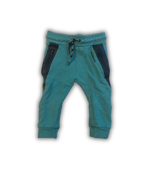 Groene set van Flinq. De set bestaat uit een hoodie en joggingbroek. Het broekje heeft een strikkoord in de tailleband voor een goed pasvorm