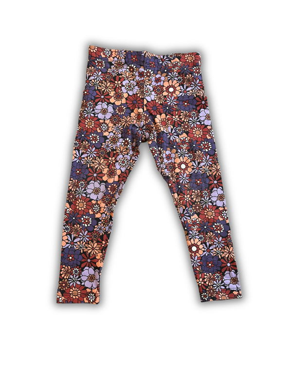Set van Wibra bestaande uit een jurk en bijpassende legging. De jurk is bruin met knoopjes en een elastieke tailleband voor een mooie pasvorm. De legging heeft een vrolijk bloemetjespatroon in diverse kleuren waarin in de bruine kleur van de jurk mooi terug komt.