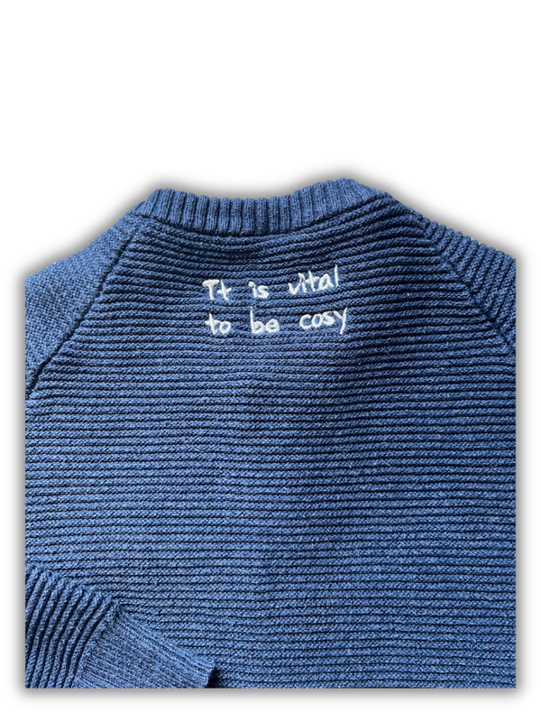 Donkerblauw gebreid vest van Pomp de Lux. Op de achterkant staat een leuke tekst geborduurd. Het vestje heeft een knoopssluiting