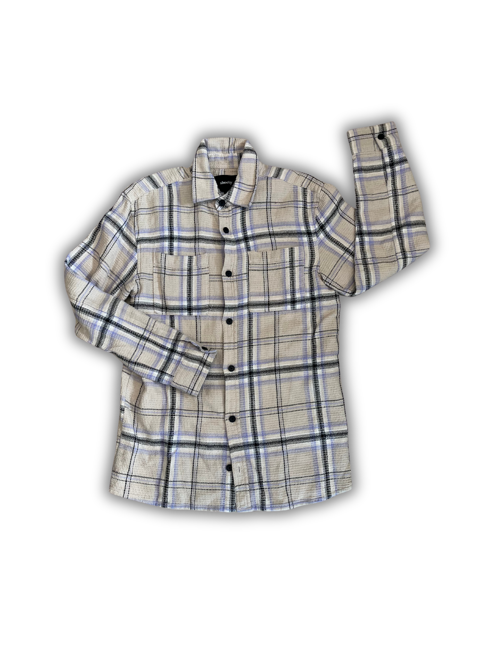 Beige blouse van Shoeby met een ruit in lila, zwart en wit. De blouse is gemaakt van een fijne luchtige wafeltjes stof