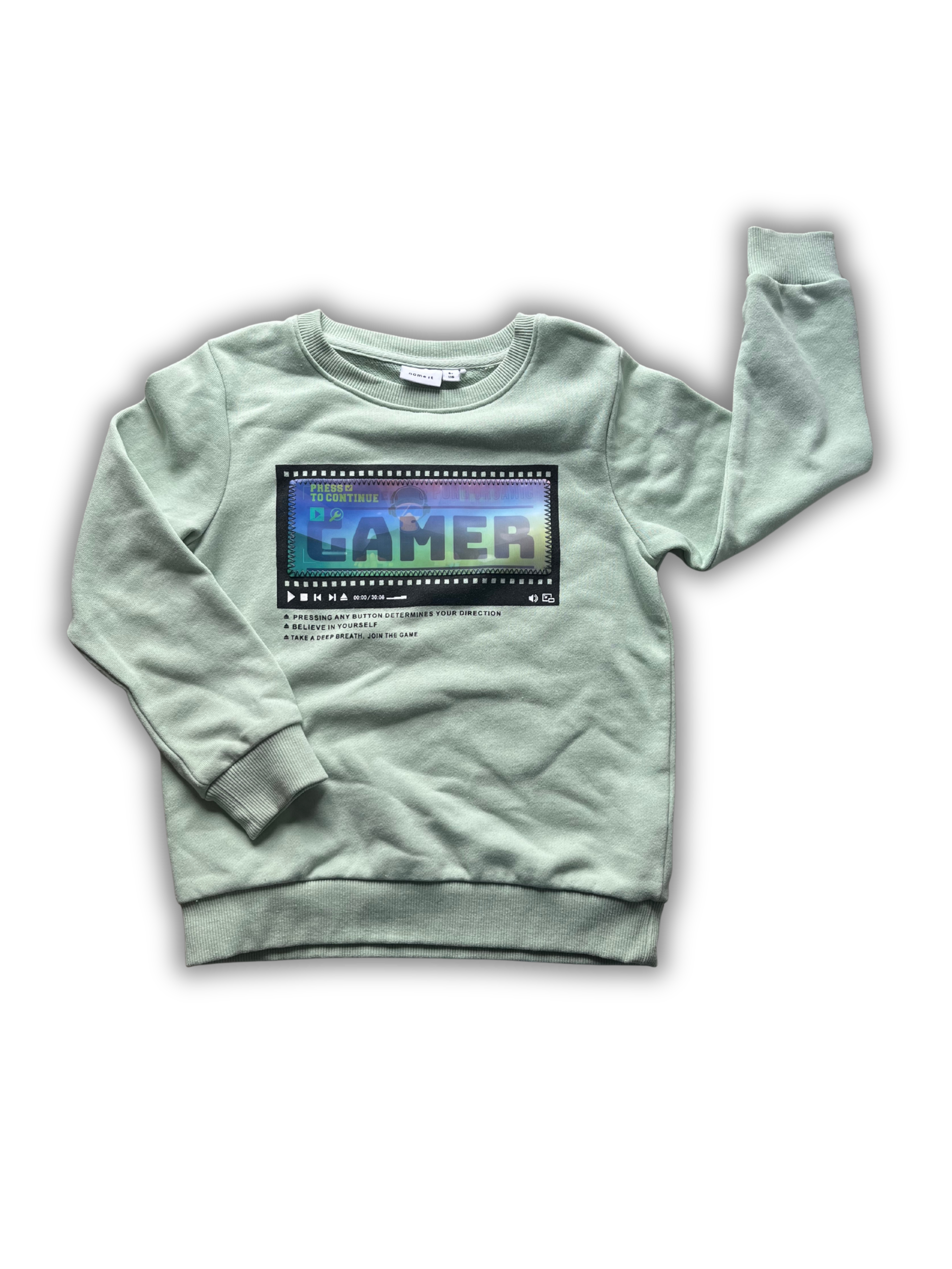 Lichtgroene sweater van Name it met holografische opdruk