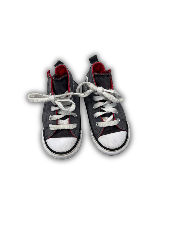 Grijze all stars van Converse. De schoenen hebben veters met aan de zijkanten klittenband.