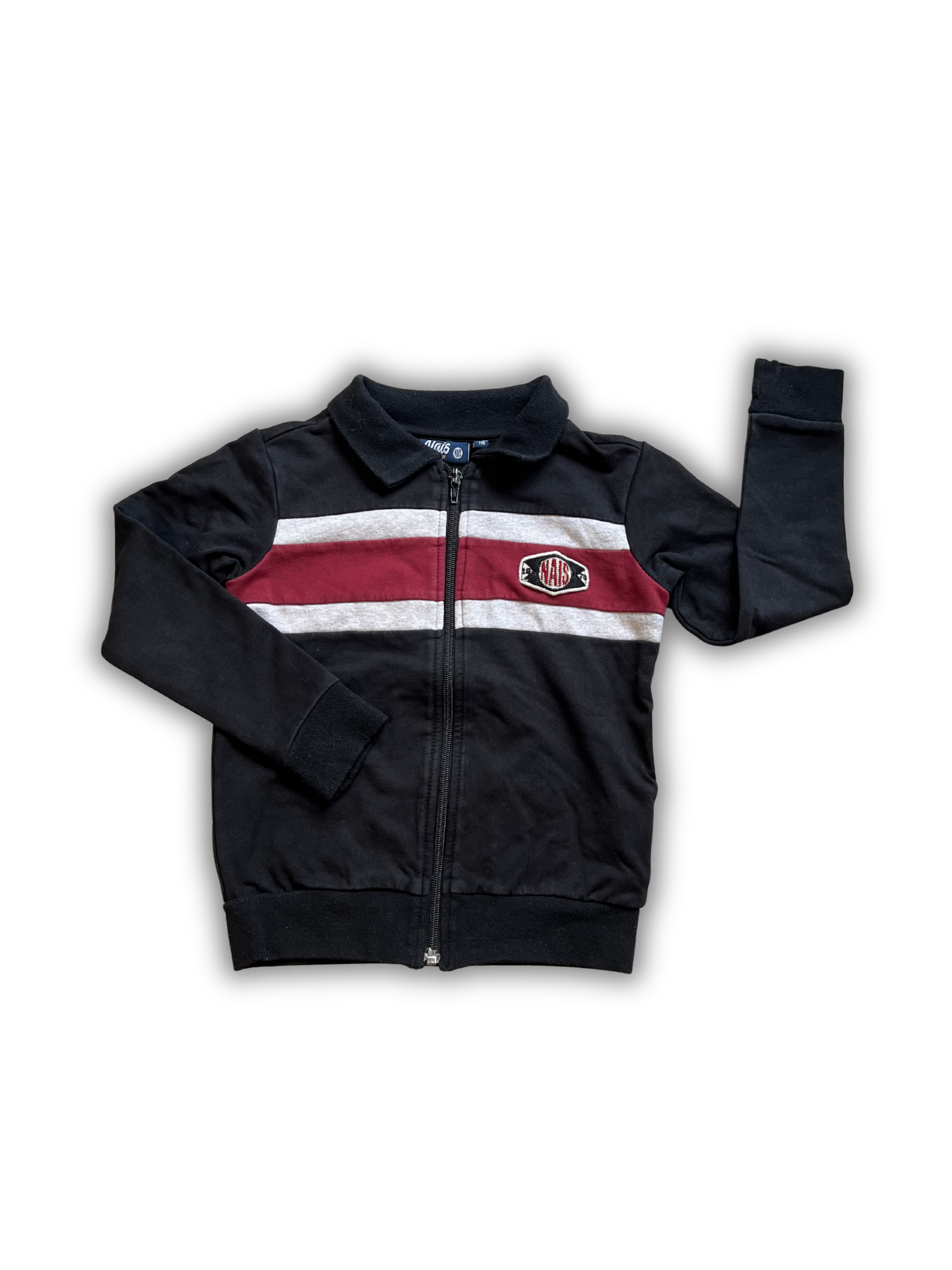 Zwart vest van Nais met polo-kraagje. Het vest heeft over de borst strepen in grijs en bordeaux rood. Verder heeft het vest een ritssluiting