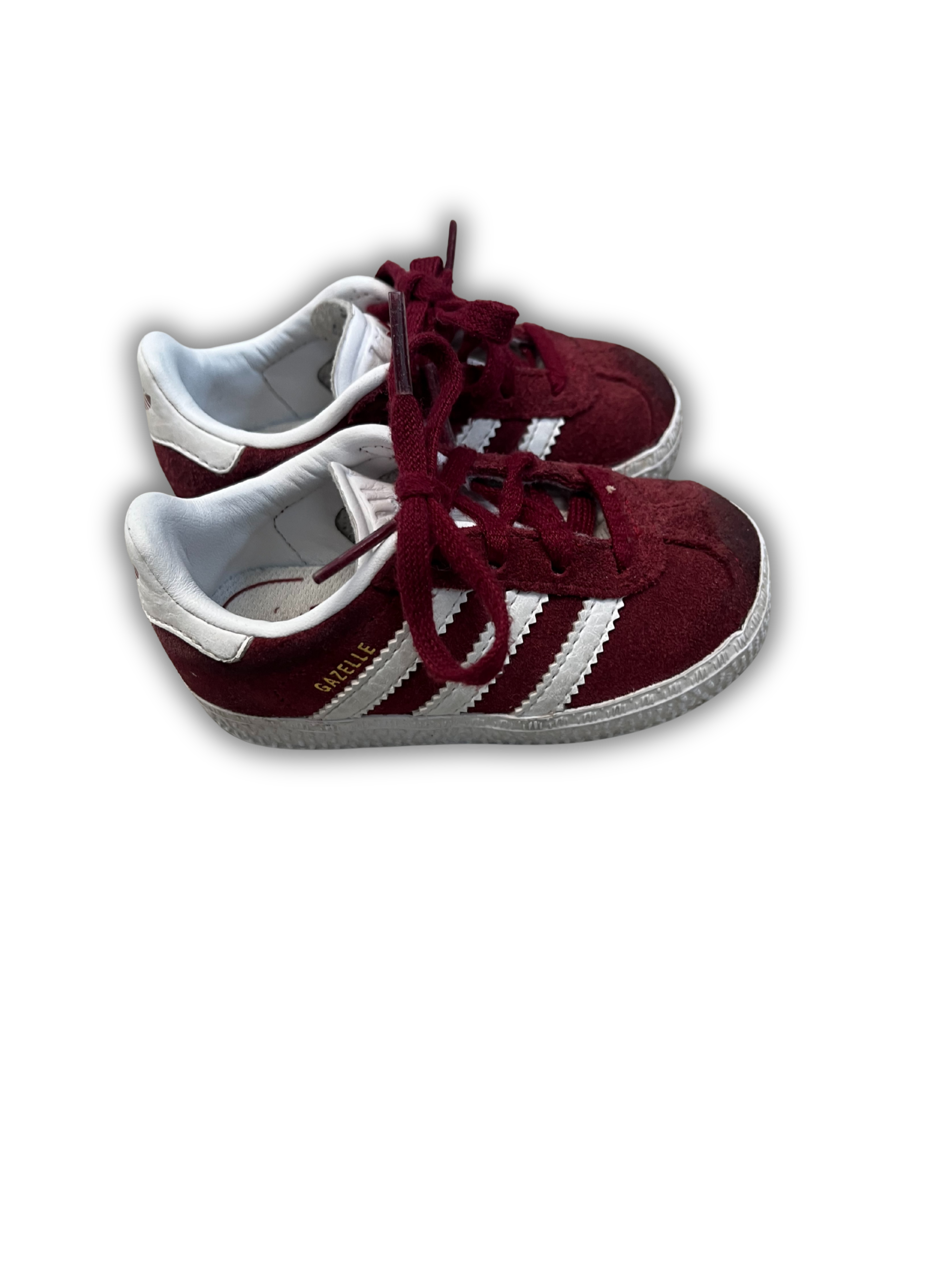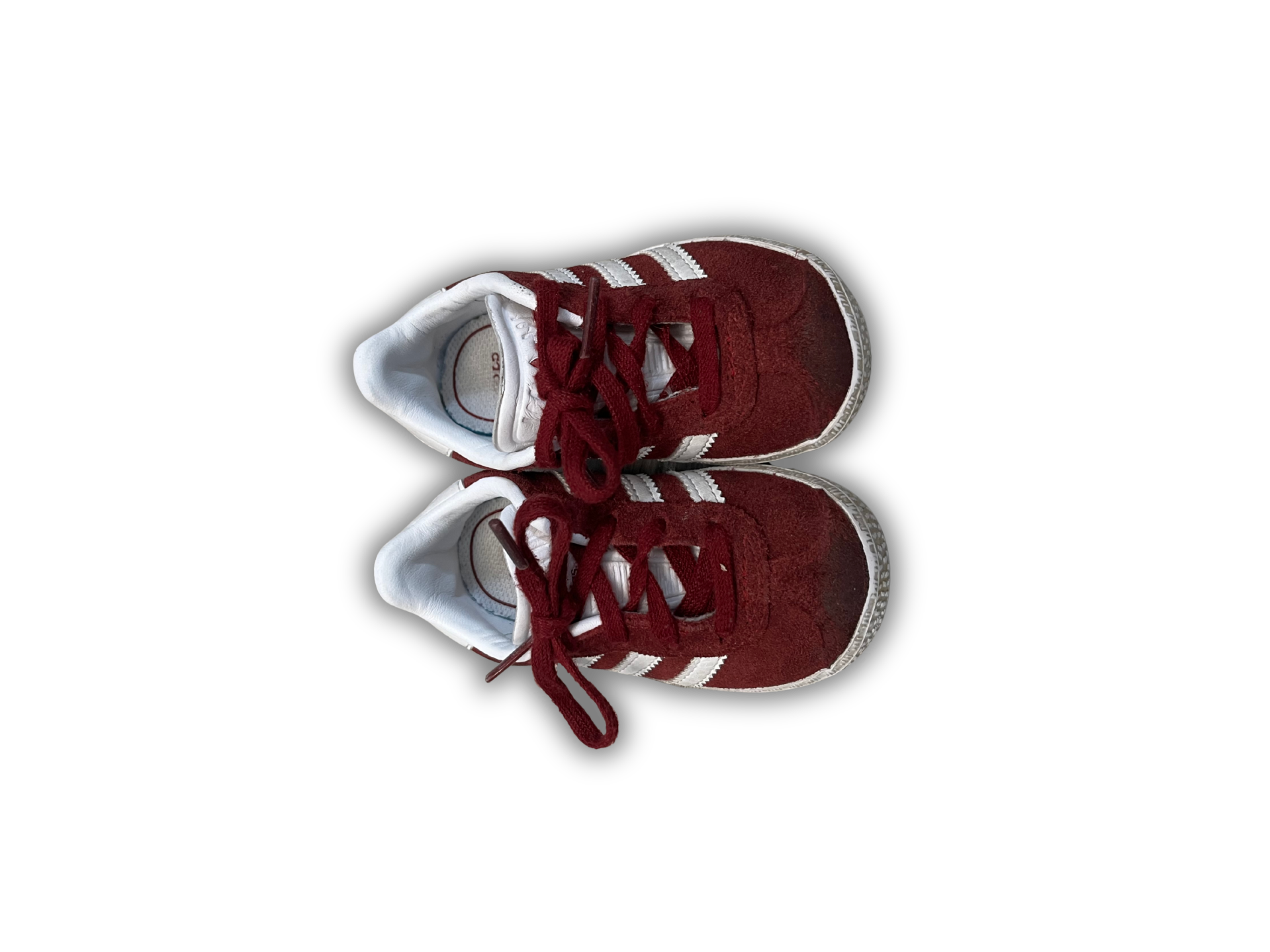 Bordeaux rode sneakers van Adidas. De neusjes van de schoenen zijn iets afgesleten