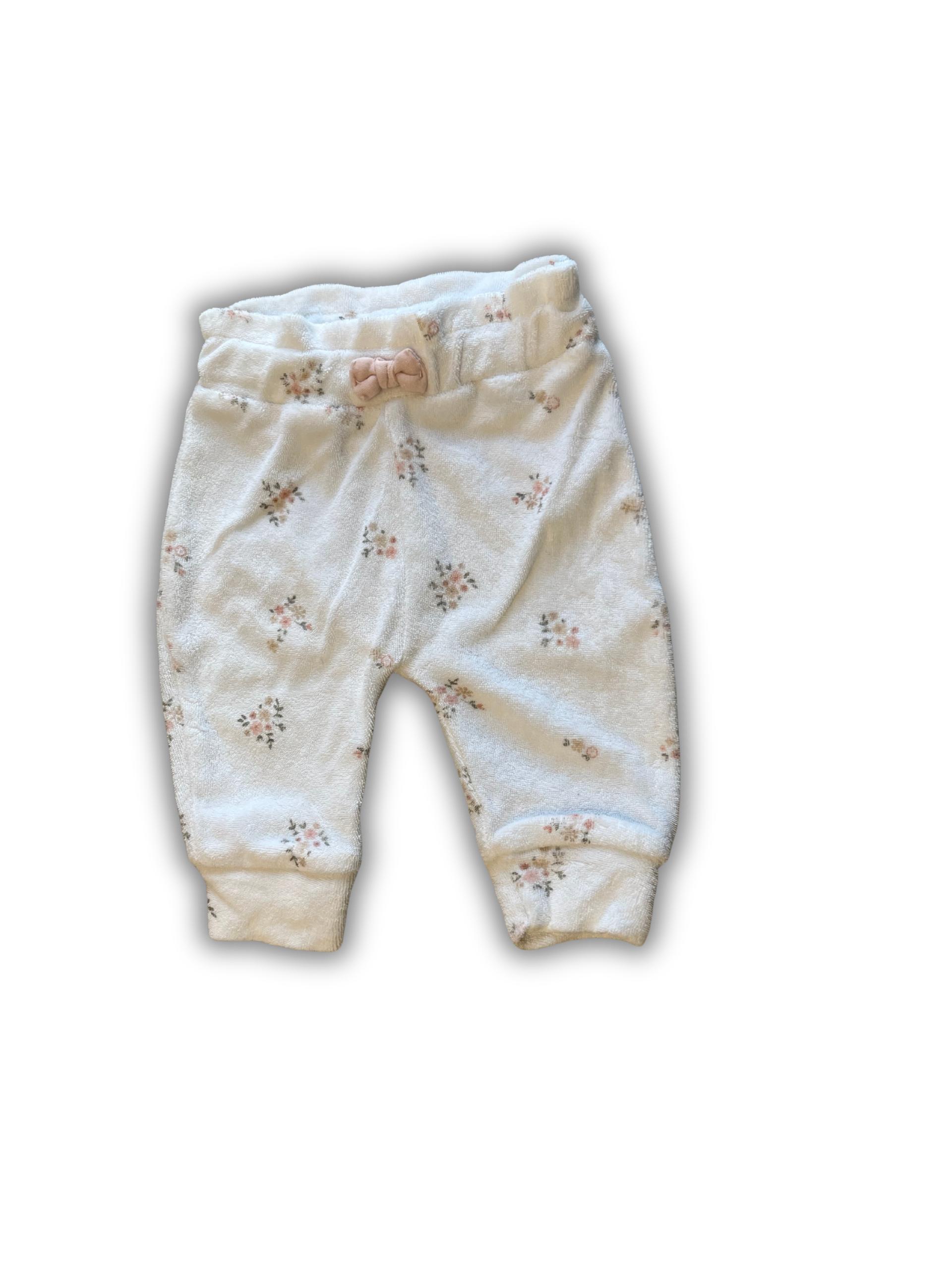 Wit broekje van Feetje. Het broekje is gemaakt van badstof en er staan roze bloemetjes op. Op de tailleband zit een roze strikje