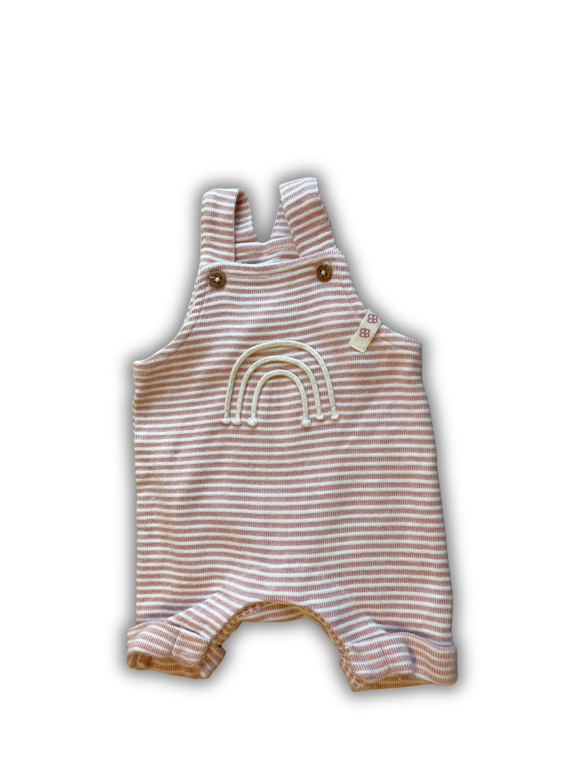 Roze/wit gestreepte tuinbroek van Bakkaboe met witte regenboog op de buik. In het kruis zitten handige drukknoopjes voor makkelijk verschonen.