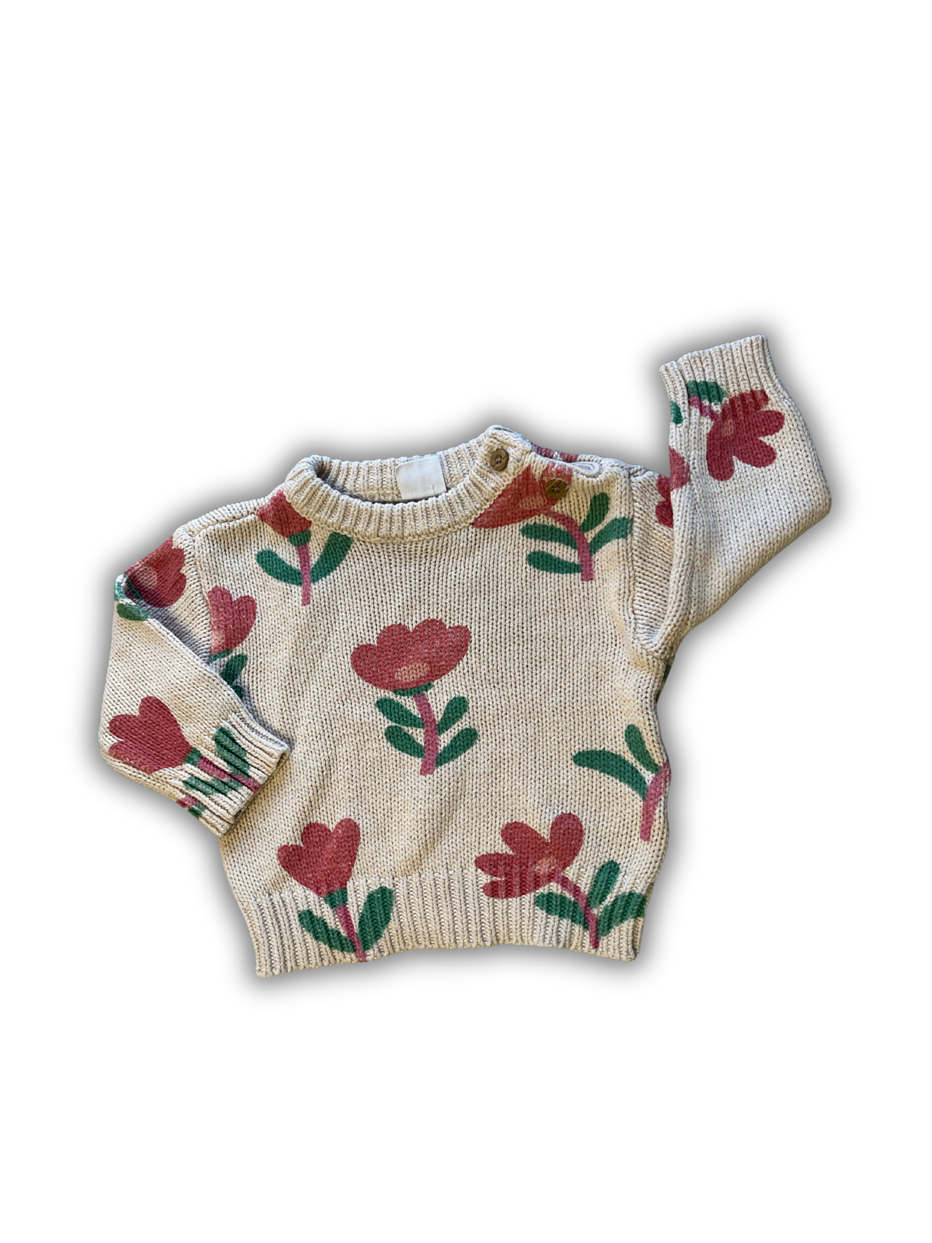 Beige gebreide trui van Hema met grote bloemen in roze/rood/groen