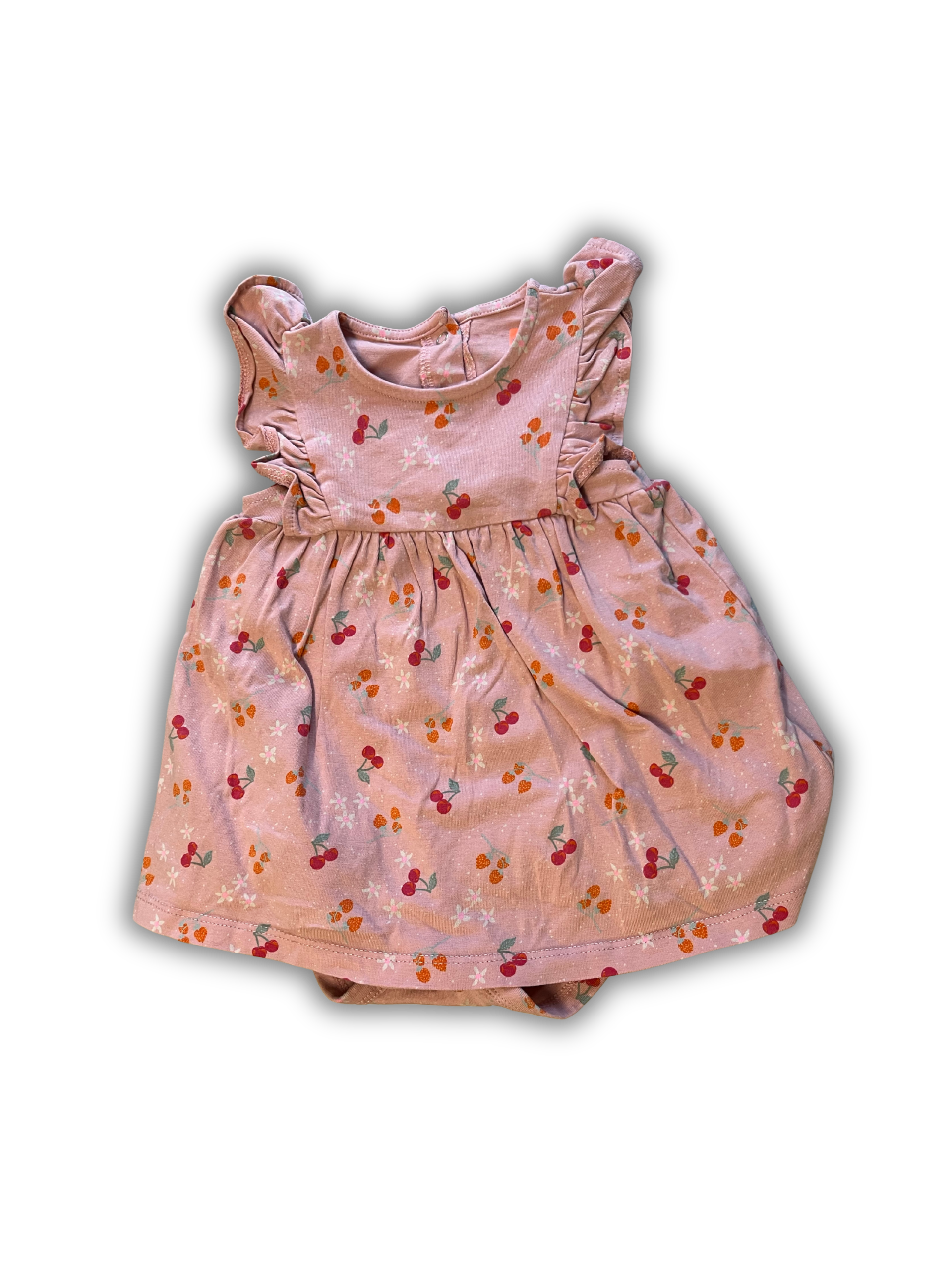 Roze mouwloze jurk van Hema. De jurk heeft een all over print van kersjes en aardbeien. Verder heeft de jurk ruffles over de schouders en een romper die vastzit in de jurk