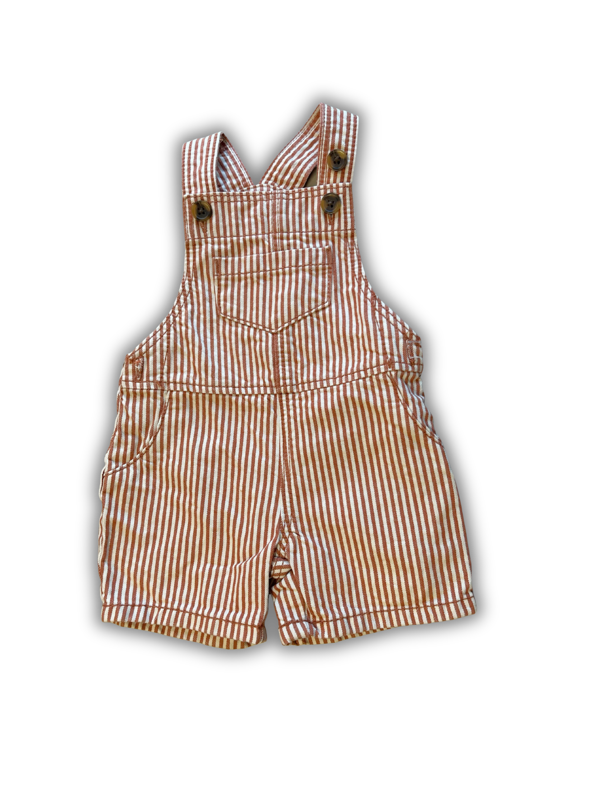 Beige/bruin gestreepte tuinbroek van Hema met korte broekspijpen. De bandjes zijn verstelbaar met knoopjes