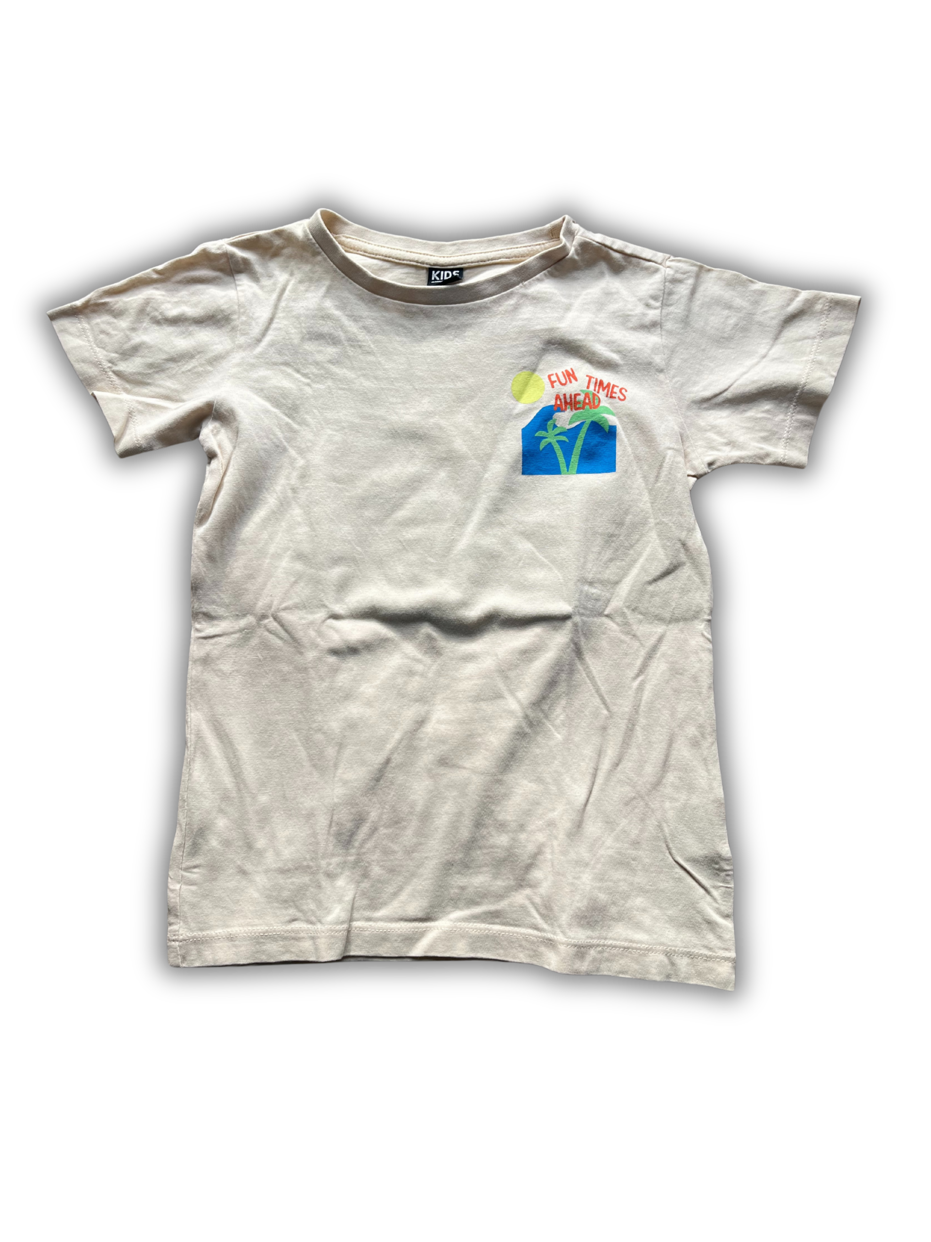 Beige t-shirt van Wibra met zomerse print op de borst en achter op de rug