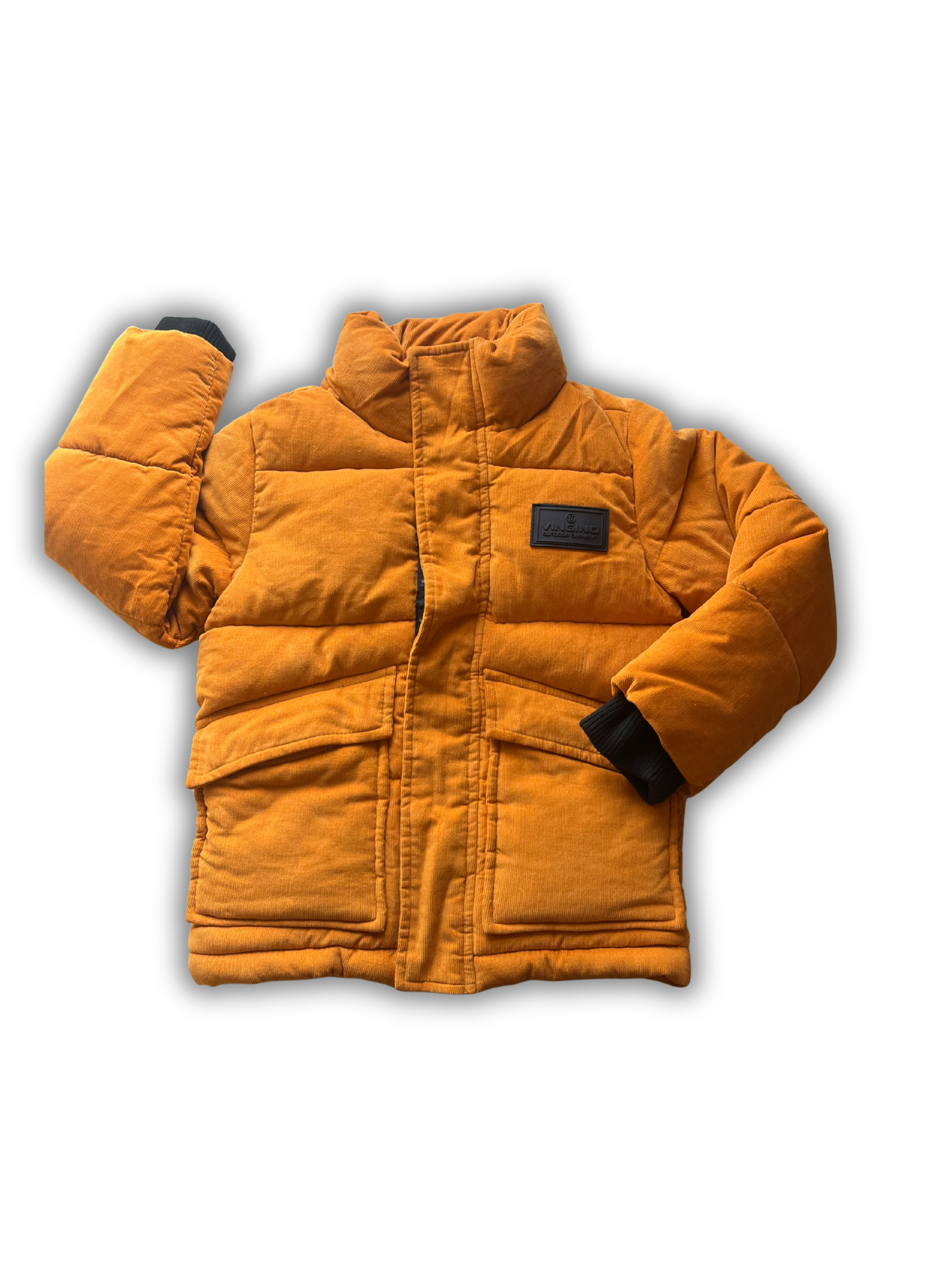 Okergele winterjas van Vingino. De jas heeft een ritssluiting en grote stoere zakken op de voorkant
